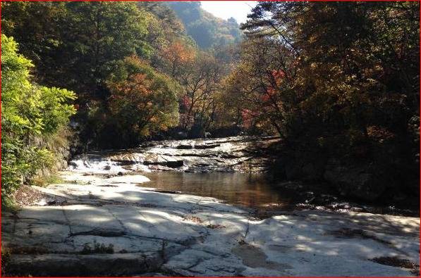 가을에는 혼효림 단풍이 마당바위와 폭포를 배경으로 펼쳐지고