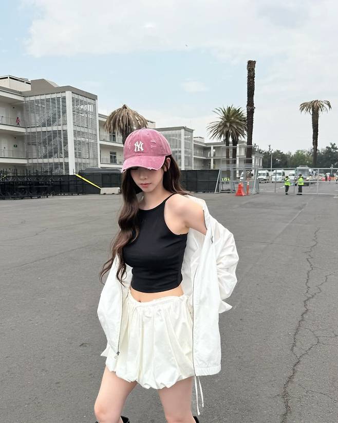 햇살이 유난히 부드럽게 내리던 어느 여름날, 카리나가 선택한 오늘의 무드는 완벽한 여름 스트릿 걸! 쿨한 분위기 가득한 화이트 집업 재킷과 블랙 크롭탑