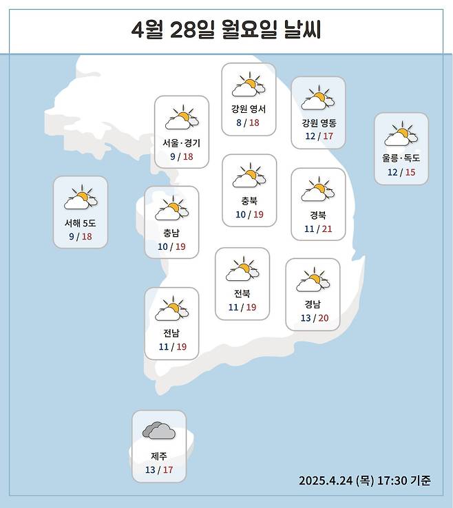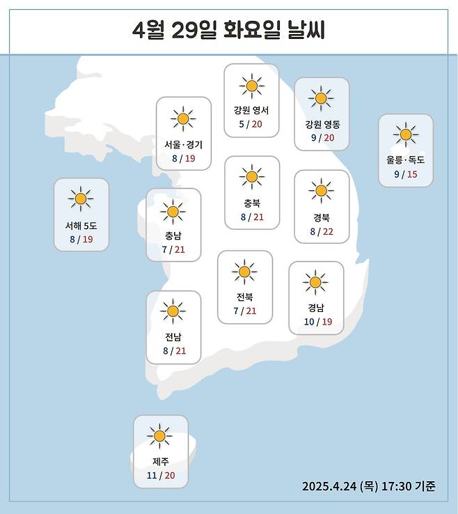 기온은 최저 8℃에서 최고 21℃를