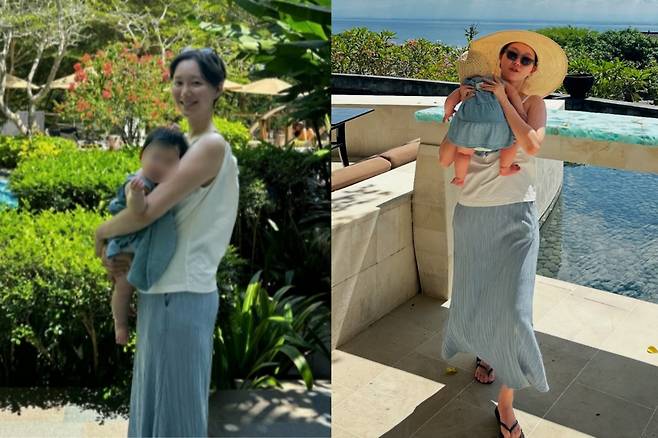 아이와 같은 패턴의 의상을 입은 모습은 보는 이들에게 따뜻한 미소를 자아내며 ‘엄마와 딸의 시밀러룩’의 정석을 보여주었어요.