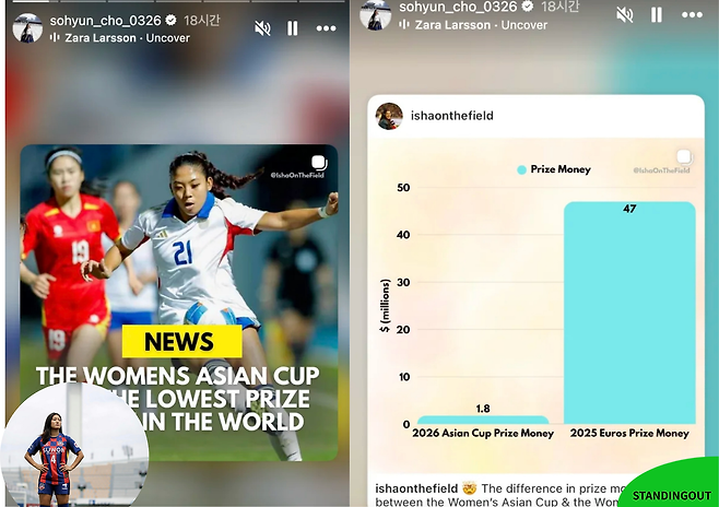 전 국가대표 미드필더 조소현은 지난 12일 개인 인스타그램 스토리를 통해 호주 출신의 여자 축구 저널리스트 아이샤의 게시글을 게재했다. 해당 게시물은 2026 여자 아시안컵과 UEFA 여자 유로 2025의 상금 차이를 노골적으로 비난하는 내용을 담고 있다. 아시안컵 총상금이 유로의 4% 수준인 26억 원에 불과하다며 격앙된 반응을 보인 저널리스트의 주장에 조소현 역시 간접 동의하며 힘을 실었다.