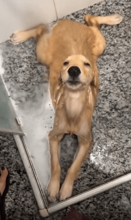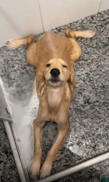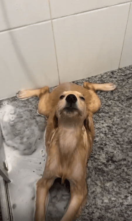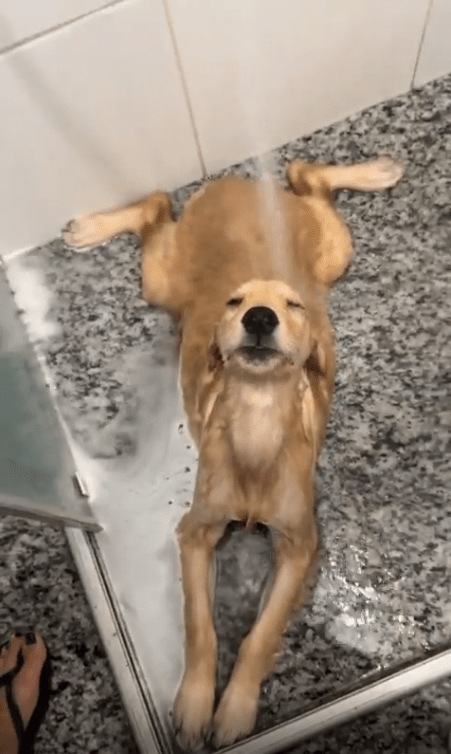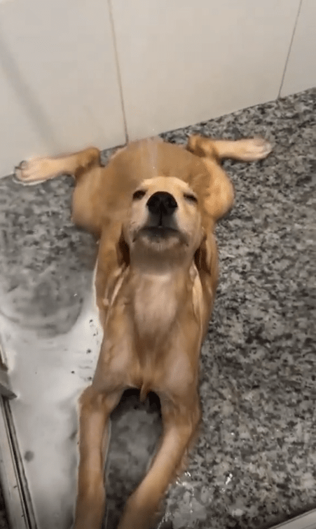 욕실 바닥에 한 마리의 개가 편안하게 누워 있었습니다. 그리고 위에서 떨어지는 샤워기 물줄기가 개의 몸을 부드럽게 적시고 있었습니다.