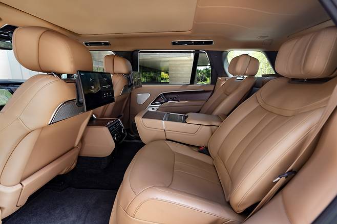 레인지로버는 운전대도 탐나지만, 뒷좌석도 탐나는 자동차다. 무릎 공간을 ‘주먹 몇 개’로 설명하는 건 의미 없다. 광활하고, 안락하다. 가운데 좌석은 버튼을 누르면 ‘스르륵’ 내려와 근사한 팔 받침대로 변한다. 뒷좌석에만 모니터를 세 개 마련했고, ‘핫 스톤’ 마사지 기능과 무릎 및 발 받침대(우측) 등 다양한 기능을 갖췄다. 2열에서 온열 마사지 받으며, 총 35개 스피커로 연주하는 음악 들으며 달리는 상상, 생각만 해도 즐겁다.