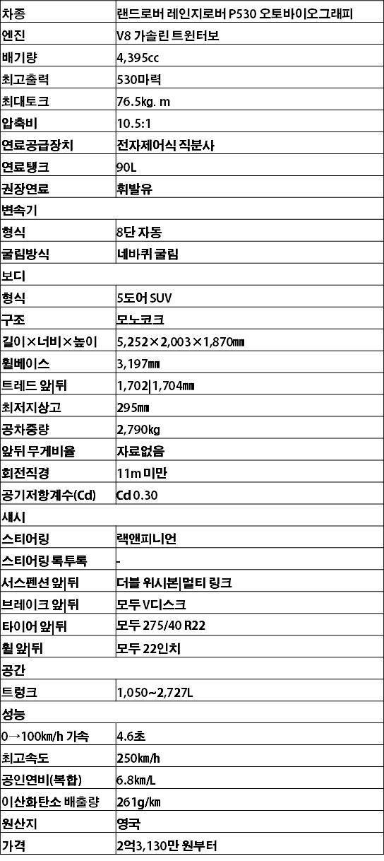 국내 시장에 먼저 투입하는 라인업은 가솔린 P530과 디젤 P350 두 가지. 시승차는 P530으로, 기존 V8 가솔린 수퍼차저 엔진 대신 BMW로부터 공급 받은 V8 4.4L 가솔린 트윈터보 엔진을 얹었다. BMW M5와 M8 등에 얹는 강력한 엔진으로, 레인지로버에 걸맞게 몇 가지 수정작업을 거쳤다. 가령, 흡기 라인을 개선해 오프로드 능력에 최적화 했다. 최고출력과 최대토크는 각각 530마력, 76.5㎏‧m. 2.8t(톤)의 거구를 0→시속 100㎞까지 4.6초 만에 가속시킨다. 기존 수퍼차저 엔진과 비교하면 저회전부터 농밀한 토크를 뿜어내, 저속부터 활기차다.