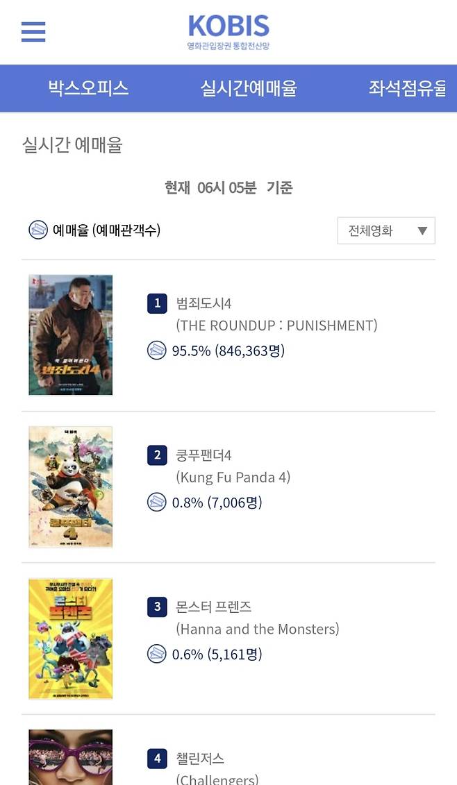 4월24일 개봉한 '범죄도시4'가 개봉 전날 사전 예매량 80만장을 넘기며 한국영화 최고 기록을 세웠다. 사진출처=영화관입장권통합전산망 캡처