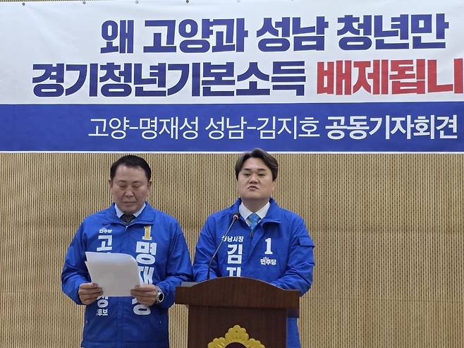 | ▲ 명재성 고양시장 예비후보와 김지호 성남시장 예비후보는 5일 오전 경기도의회 브리핑룸에서 공동 기자회견을 열고 "고양과 성남 청년들이 청년 정책의 사각지대에 놓여 있다"며 경기청년기본소득 참여 복원을 촉구했다. |
