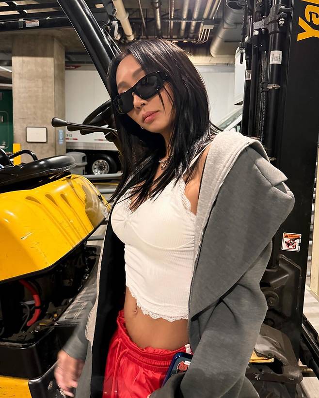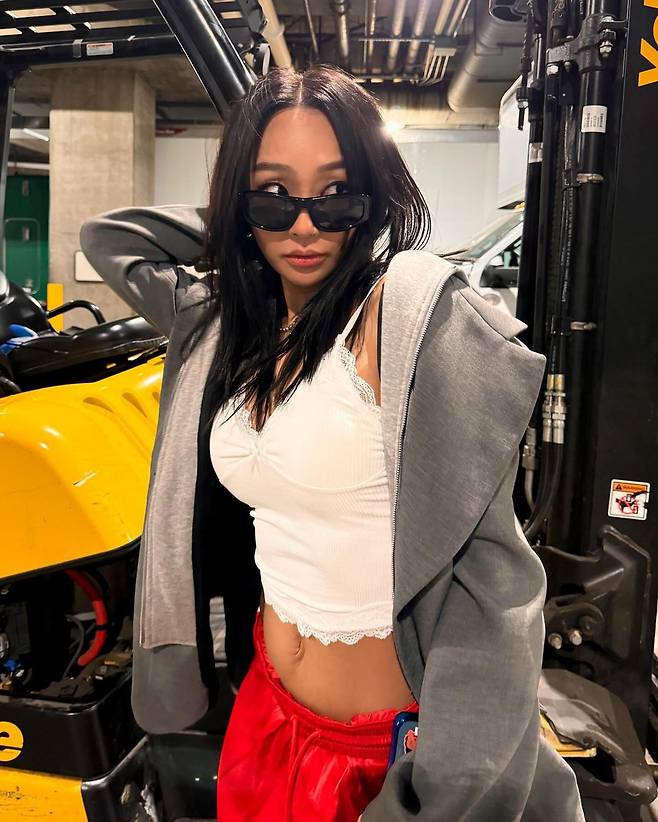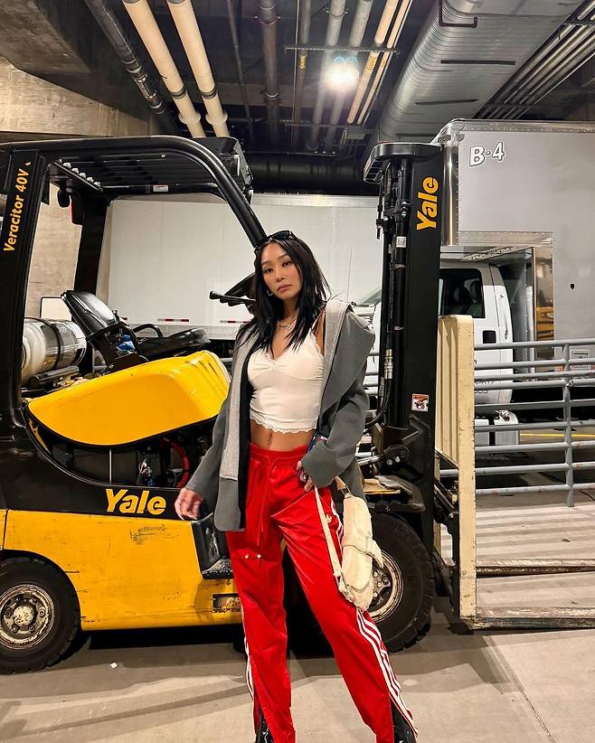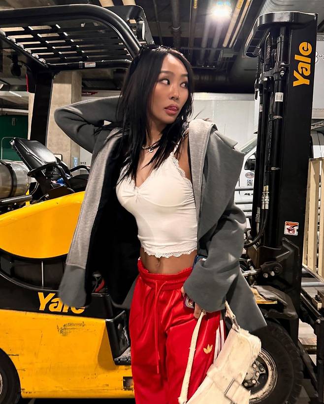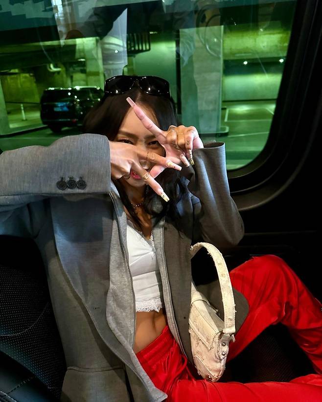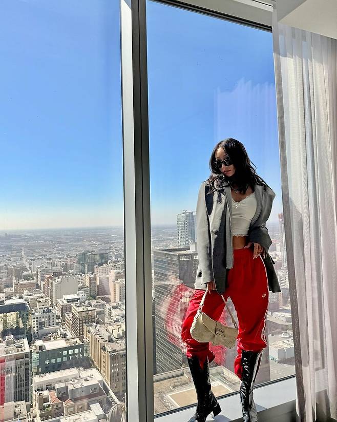 효린은 빨간색 아디다스 트랙팬츠에 흰색 레이스 크롭탑, 회색 블레이저를 매치해 완벽한 믹스매치 코디를 선보였어요.