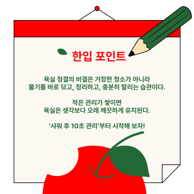 해답은 의외로 단순하다. 더러워지기 전에 관리하는 작은 습관을 들이는 것이다. 몇가지 기본 루틴만 지켜도 물때와 곰팡이를 충분히 줄일 수 있다.