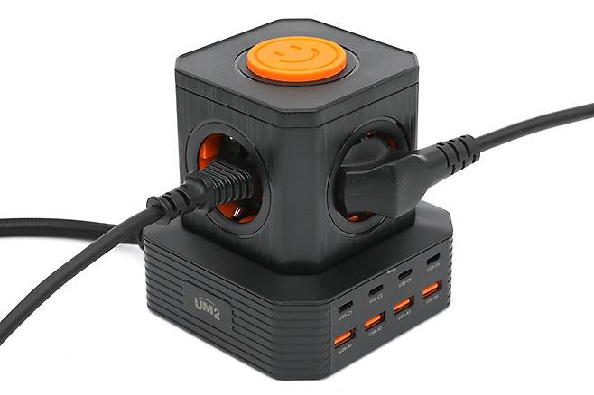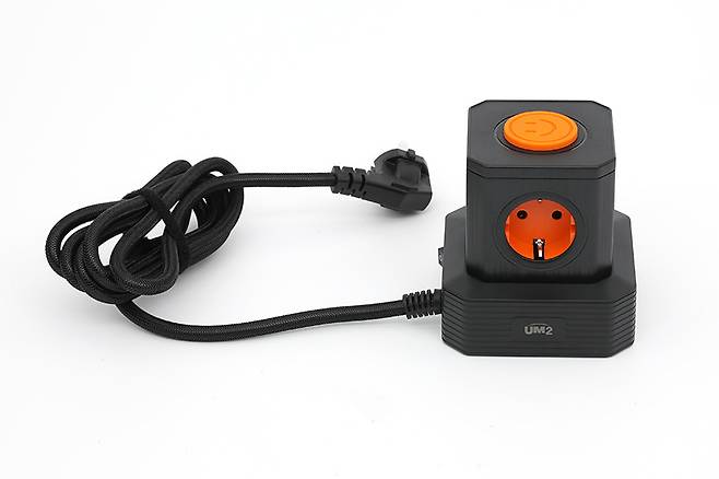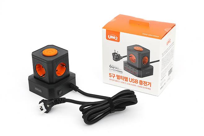 UM2 타워 5구 멀티탭 4000W 8포트 멀티 충전기 UMAC-65W / 100W는 흰색 바탕에 오렌지색 포인트가 들어간 박스 패키지에 담겨있다. 본체의 색상은 블랙과 화이트 두 가지인데, 100W 모델은 블랙으로만 출시되었다.