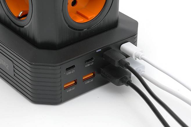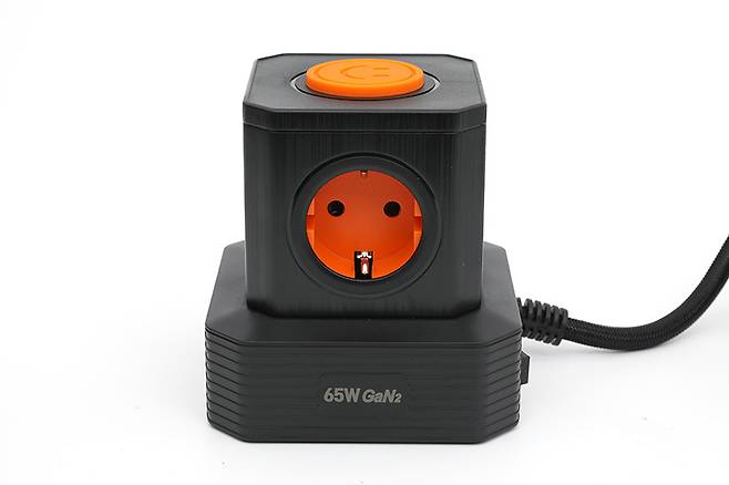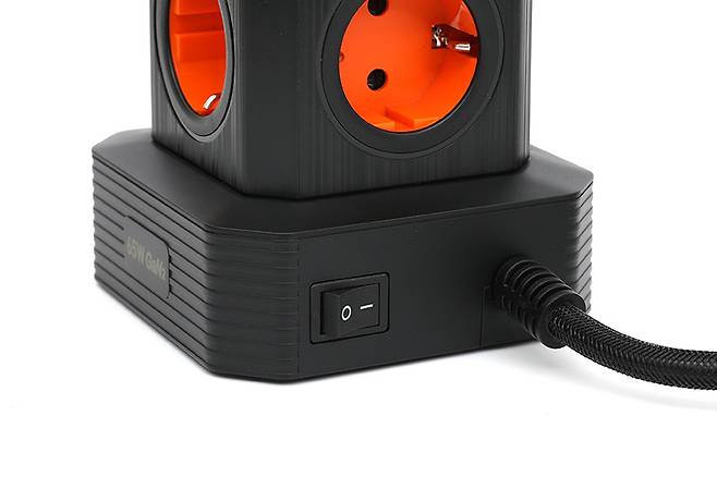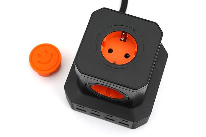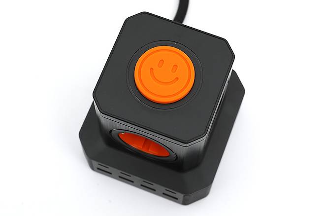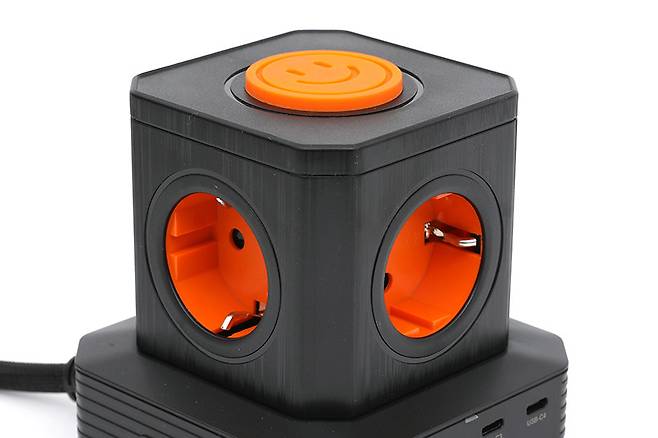 콘센트 안쪽은 오렌지색으로 되어있어서 깔끔하면서도 강렬한 느낌을 전해주고 있다. 콘센트 안쪽을 보면 접지형임을 알 수 있다. 콘센트는 타워의 옆면 네 군데와 윗면까지 총 5구를 지원하고 있다.