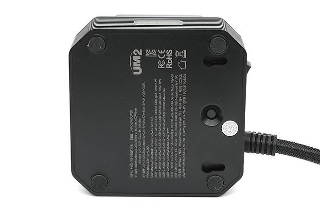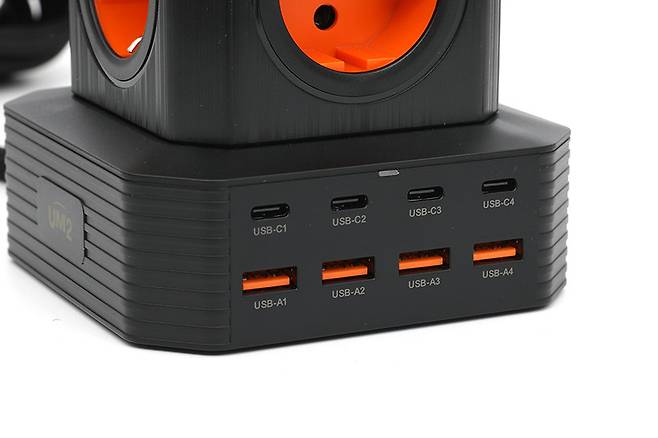 UM2 타워 5구 멀티탭 4000W 8포트 멀티 충전기 UMAC-65W / 100W는 메인 스위치 반대편 측면 하단에 USB A타입 네 개와 USB C타입 4개 도합 여덟 개의 USB 포트를 갖추고 있다.