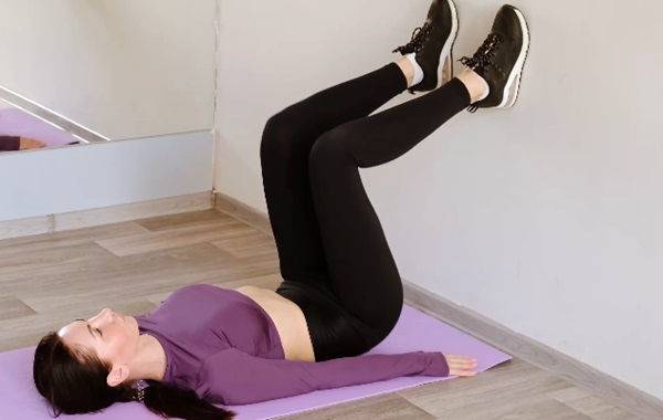 벽 앞에 등을 대고 바닥에 눕습니다. 다리를 벽에 올리고, 무릎을 구부린 상태에서 발바닥을 벽에 붙입니다. 팔은 몸 옆에 두고 손바닥을 바닥에 둡니다. 엉덩이를 들어 올렸다가 다시 엉덩이를 바닥으로 내립니다.