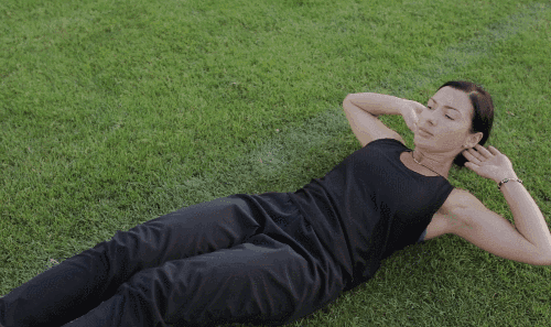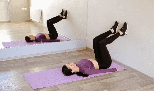 매트에 등을 대고 누운 상태에서 손을 머리 옆으로 이동합니다. 다리를 공중으로 들어 올립니다. 무릎을 구부리면서 다리를 상체 방향으로 당깁니다. 동시에 상체를 약간 일으켜 복부 전체에 자극을 줍니다.