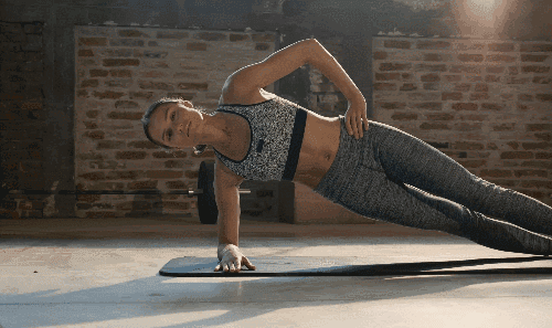 오른쪽 팔뚝을 매트에 대고 옆으로 누워서 시작합니다. 엉덩이를 들어 올려 사이드 팔꿈치 플랭크 자세를 만듭니다. 왼손은 옆구리에 가볍게 올립니다. 시선은 정면을 응시하며 자세를 유지합니다. 반대편으로 돌아서 반복하세요.