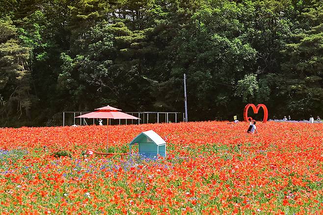 주인공인 선홍빛 꽃양귀비는 물론, 보랏빛 수레국화, 알리움, 페츄니아, 캘리포니아포피(금영화)까지 총 40여 종의 꽃들이 정원을 수놓는다. 자연 속 산책로를 따라 걷다 보면 마치 꽃의 바다에 파묻힌 듯한 기분이 들 정도다.