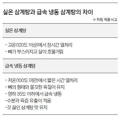 하림 삼계탕은 24시간 이내에 잡은 신선한 닭과 몸에 좋은 부재료를 넣어 만든 삼계탕을 영하 35도 이하에서 급속 냉동한 제품이다. 급속 냉동과 일반 냉동의 차이는 ‘최대 빙결정 생성대’를 지나는 속도에 있다. 식품은 보통 영하 1~2도부터 얼기 시작하고 영하 5도에 이르면 얼음 결정이 가장 많이 생성된다. 이 구간을 ‘최대 빙결정 생성대’라고 하며, 이 구간을 빨리 통과하기 위해 개발된 것이 급속 냉동 기술이다.