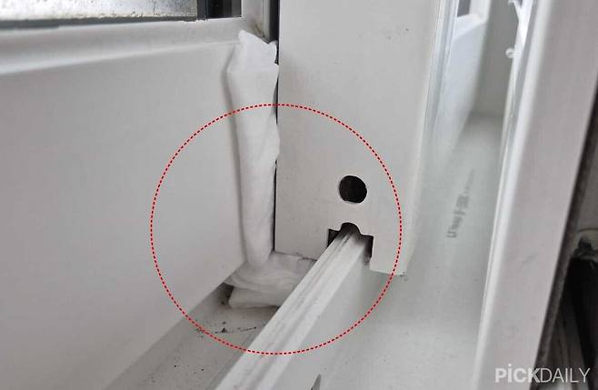 창틀 바닥쪽을 보면 빗물구멍이라 불리는 구멍이 여러개 있다. 이 구멍은 빗물이 가득 차서 흘러 넘치지 못하도록 하는 구멍인데 이 부분을 통해 바퀴벌레, 날파리, 무당벌레 등이 많이 들어올 수 있으므로 꼭 막아 주도록 하자.