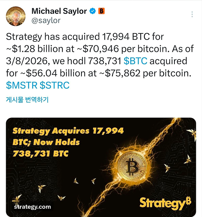 9일(현지시간) 마이클 세일러 스트레티지(MSTR) 의장에 따르면, MSTR은 1만7994개의 비트코인을 12억8000만달러에 매입했다.