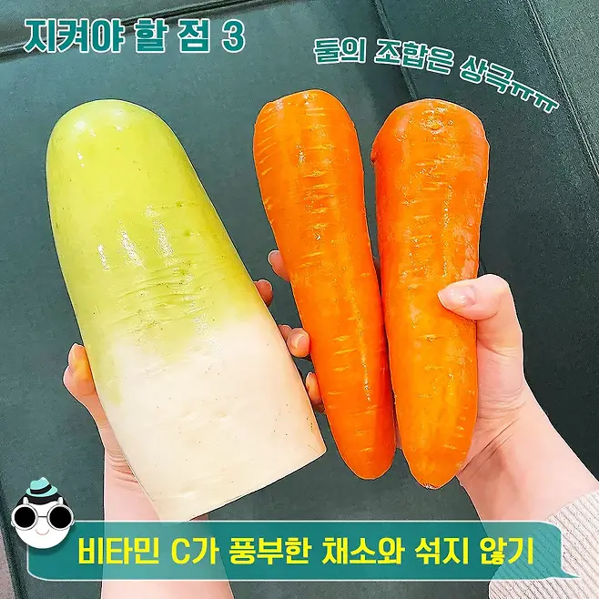 당근은 저희가 갈아서 주스로도 많이 이용하는 식재료죠! 이때 주의할 점이 있어요. 바로 무, 배추, 시금치처럼 비타민 C가 풍부한 채소와 섞어서 먹는 것은 좋지 않답니당.