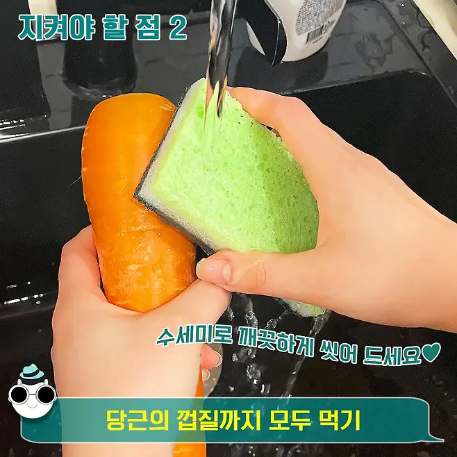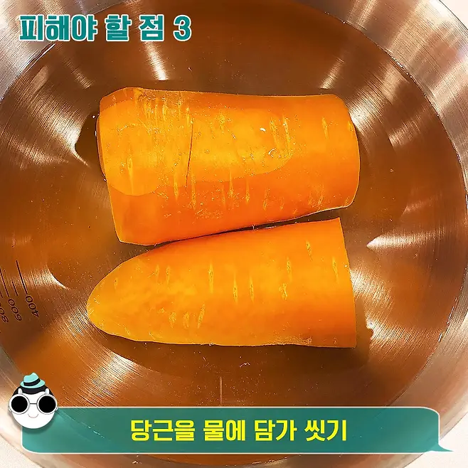 물에 담가 놓으면 껍질의 수용성 영양소가 녹아 버려요ㅠ 따라서 당근을 씻을 때는 물에 담가 놓지 마시고! 꼭꼭 흐르는 물에 씻어서 드세요~
