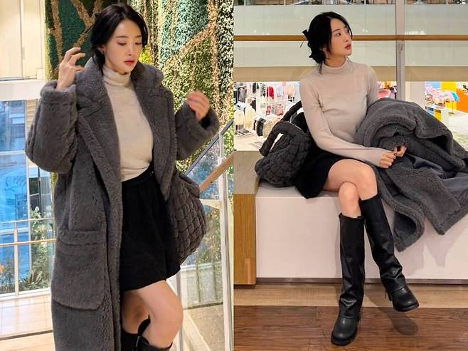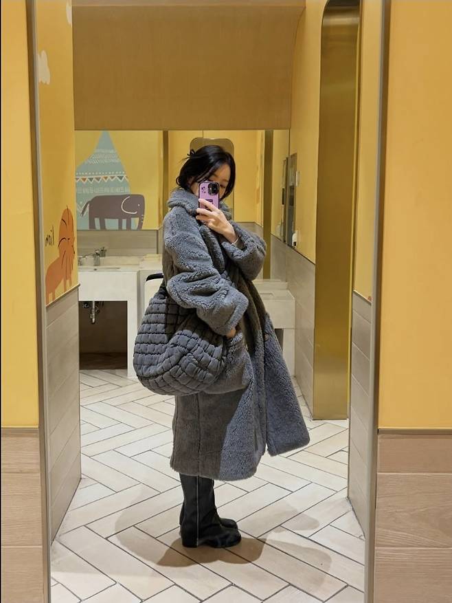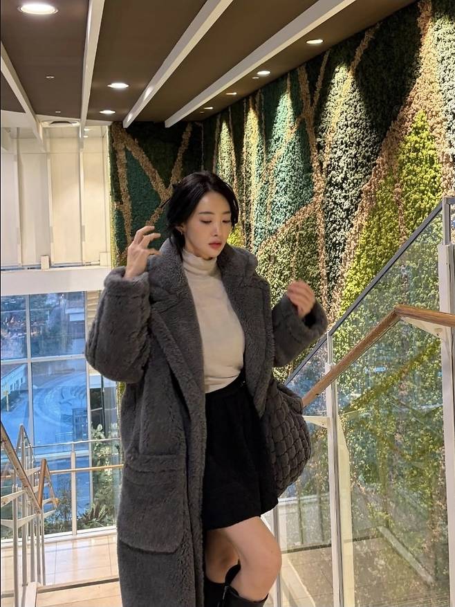 여기에 툭 들린 퀼팅 백으로 텍스처 포인트를 더하고, 코트의 포슬포슬한 결감, 가방과 부츠의 매끈한 소재가 맞물리며 사진마다 다른 공간에서도 룩의 중심이 흔들리지 않았습니다.