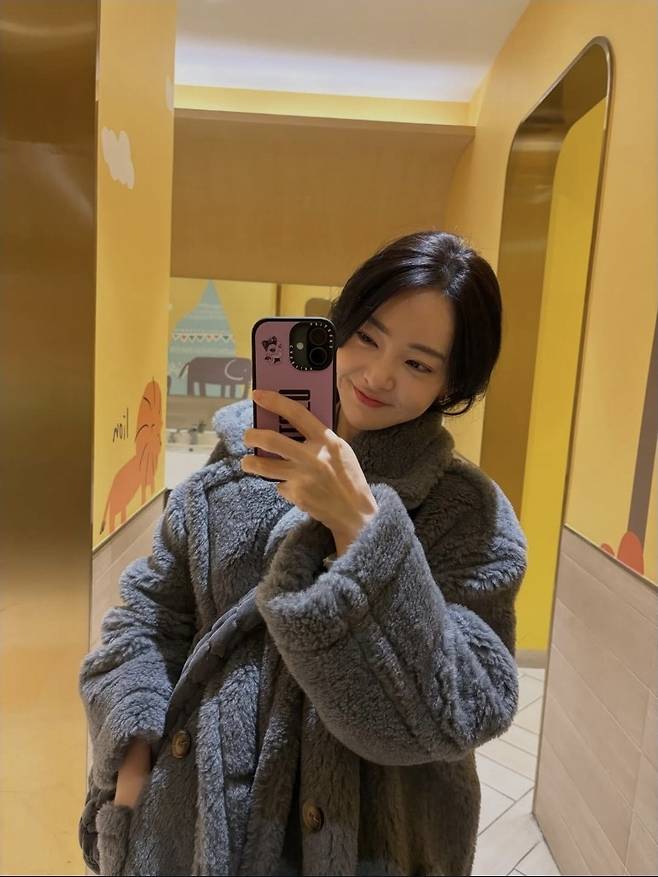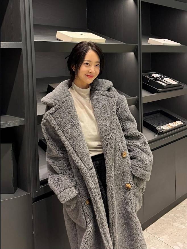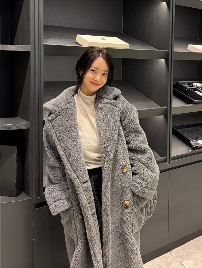 안이서는 묵직하게 떨어지는 그레이 테디 퍼 코트를 아우터로 선택해 보온성과 존재감을 동시에 잡았고, 안에는 베이지 톤의 하이넥 니트를 매치해 얼굴빛을 환하게 살리면서도 톤을 부드럽게 정돈했습니다.