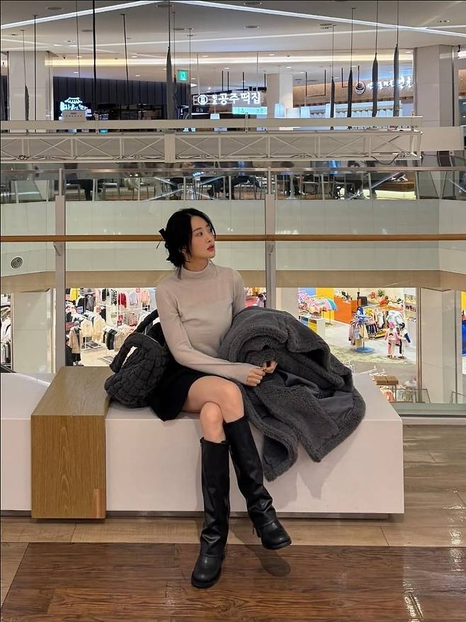 하의는 블랙 미니스커트로 간결하게 끊어 심플하면서도 사랑스러운 느낌을 자아냈고, 무릎까지 올라오는 블랙 롱부츠로 실루엣을 한 번 더 매끈하게 이어 전체적인 비율이 길어 보이게 했습니다.