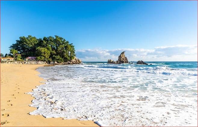 해변에는 다양한 크기의 기암괴석들이 자리해 있으며, 그중 촛대처럼 우뚝 솟은 ‘촛대바위’는 보는 방향에 따라 다양한 형상으로 보이는 자연 조각 작품입니다.