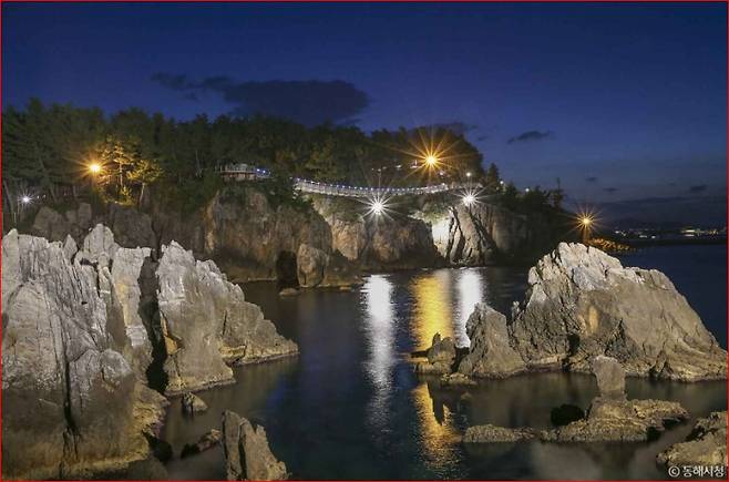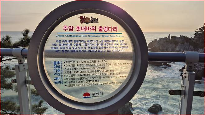 추암해변과 인접한 이 다리는 2019년 6월에 개장했으며 길이 72m로 바다 위를 가로지르며 설치되어 있어 바다 위를 걷는 듯한 스릴과 함께 추암의 해안 절경을 감상할 수 있는 이색 명소입니다.