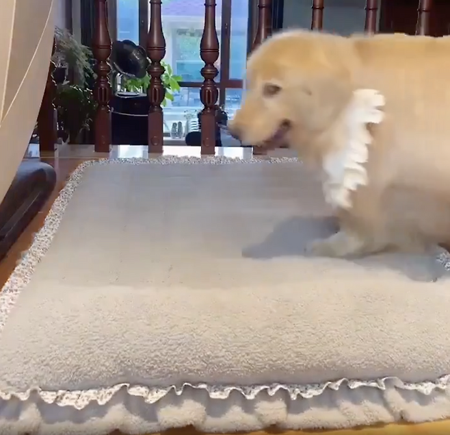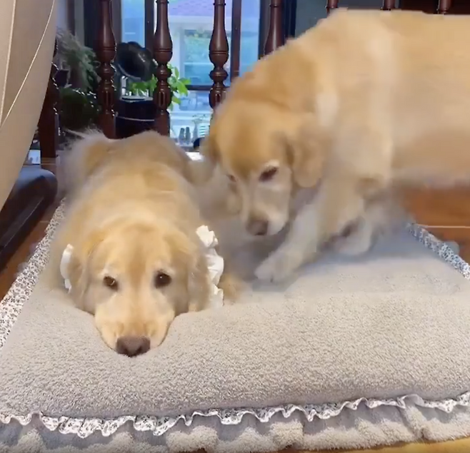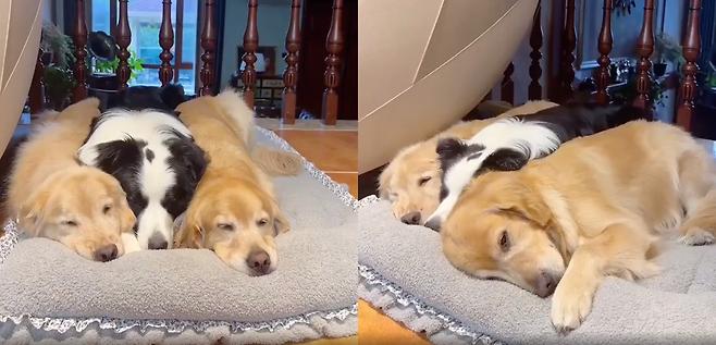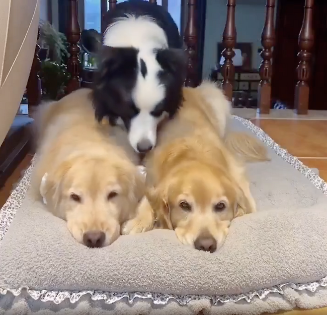 좁은 강아지 침대에 골든 리트리버 두 마리와 보더콜리 한 마리가 함께 누워 있는 모습은 정말 사랑스럽습니다. 침대는 작아 보이지만, 이들은 서로를 의지하며 편안하게 잠들고 있습니다.