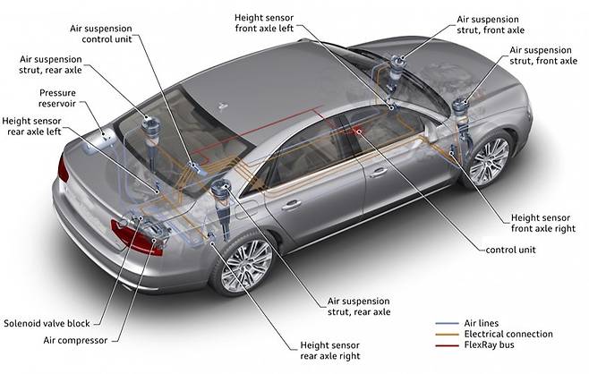 에어 서스펜션은 도로나 주행 조건에 따라 차량 높낮이를 자동으로 조절하는 첨단 기술이다. 금속 스프링 대신 공기압을 이용해 진동과 충격을 흡수하며, 주행 속도와 주행 모드에 따라 차체 높이를 실시간으로 조정한다.