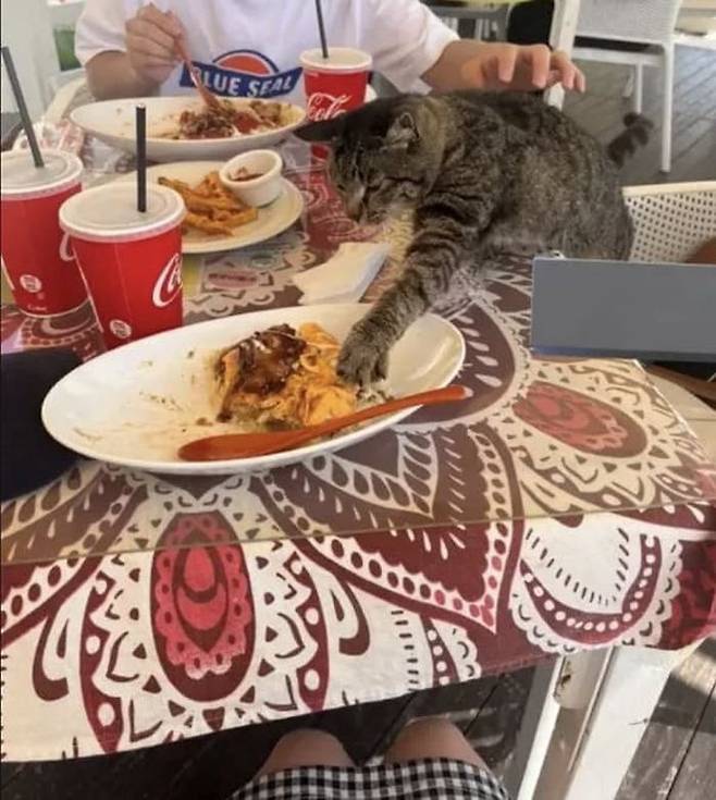 일본 관광객이 식당에서 맛있는 음식을 사진으로 찍으려던 순간 이 고양이가 쏜살같이 나타난 것이 아니겠습니까.