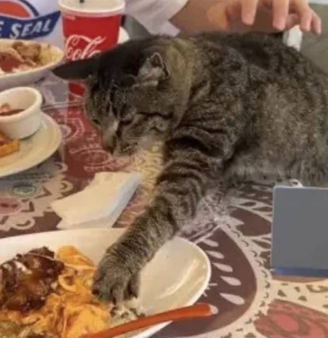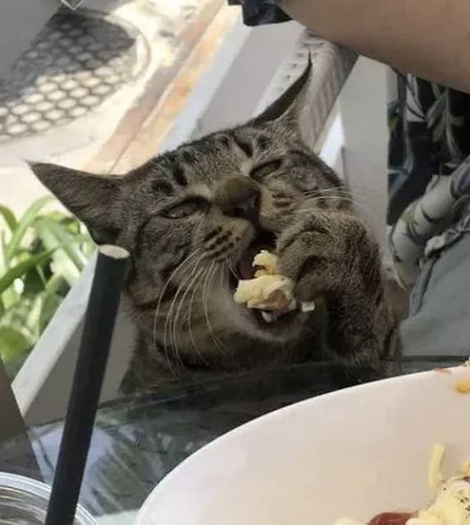 무엇보다 놀라운 사실은 시간이 지날수록 고양이는 더욱 대담해져서 이제는 아예 식탁 위로 올라와 음식을 먹는 모습까지 포착되었다는 것인데요.