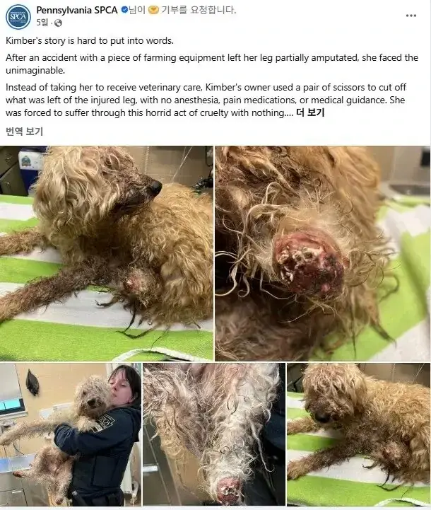 보호소가 게재한 사진들은 처참하게 다리를 잃은 킴버의 환부를 똑똑히 보여줬다. 차마 눈 뜨고 볼 수 없을 정도로 끔찍한 모습.