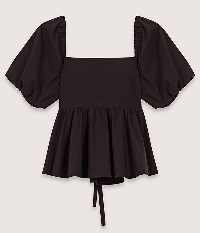 벌룬 슬리브와 러플잡힌 밑단이 연출하는 다양한 볼륨감이 매력인 포플린 탑으로 스퀘어넥, 타이 디테일이 더해진 오픈 백 디자인으로 러블리한 분위기를 연출한다.