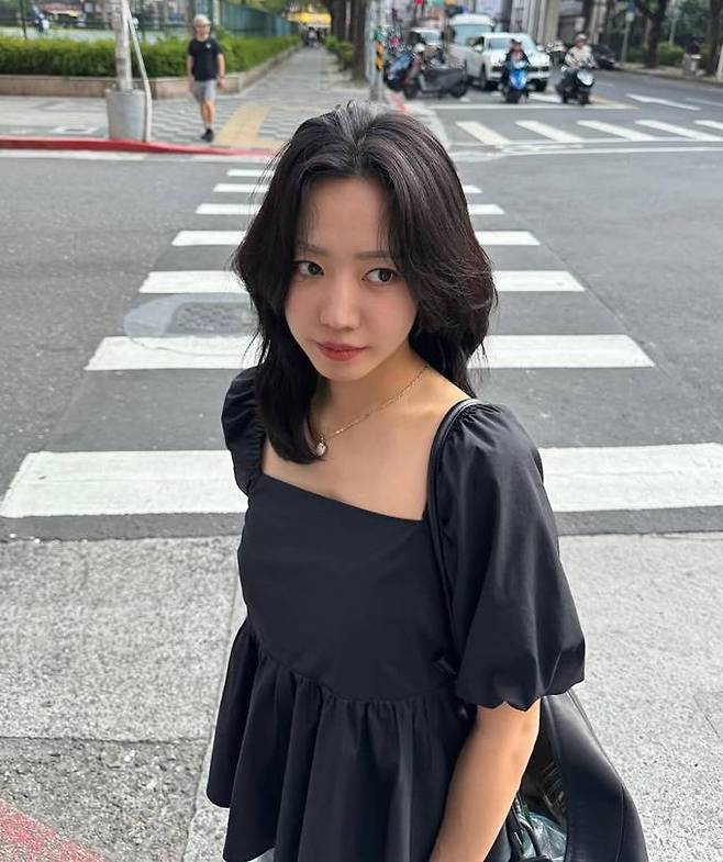 그룹 에이핑크 김남주가 벌룬 블라우스로 걸리시한 싱가포르 여행 일상룩을 연출했다.