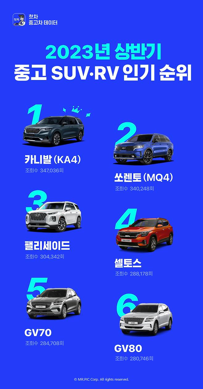 해당 순위는 2023년 상반기 기간 (2023. 01. 01 ~ 2023. 05. 31) 내, 첫차 앱에 등록된 모든 국산·수입 SUV·RV 중고 매물의 조회 데이터를 기반으로 선정했어요.