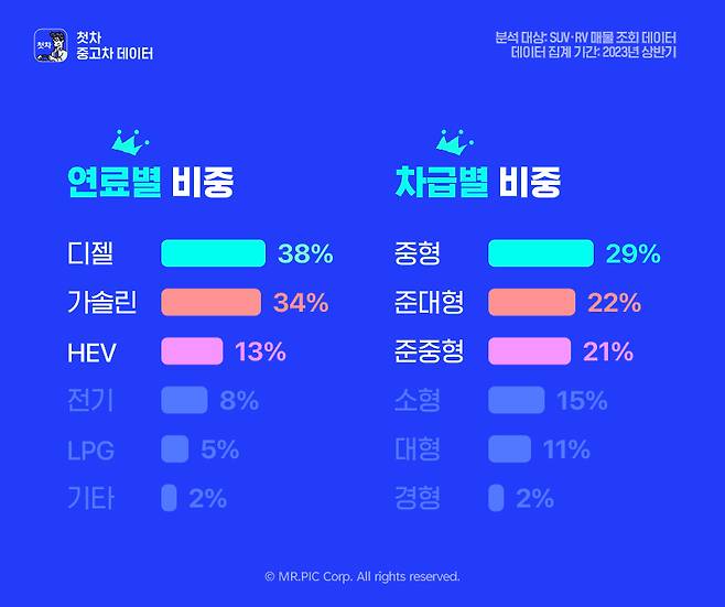 연료별 비중으로는 디젤이 가장 높았어요. 38%를 차지해 약 5대 중 1대 가량은 디젤인 것으로 나타났는데요. 아무리 친환경차가 대세라지만 아직 중고차 시장에서는 디젤 SUV의 인기를 쉽게 꺾을 수는 없는 모양이에요. 유지비도, 차량 가격도 저렴하기에 디젤은 앞으로도 굵고 긴 수명을 이어나갈 것으로 보입니다.