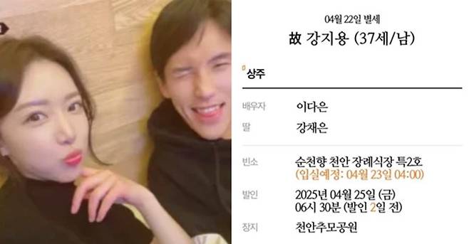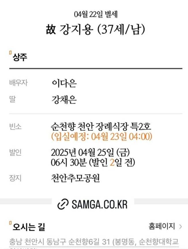 강지용 사망 소식은 축구선수 출신 구본상의 인스타 스토리 게시글을 통해 알려졌다. 고인은 23일 세상을 떠난 것으로 알려졌고 빈소는 순천향 천안 장례식장이다. 오는 4월 25일 금요일 발인 예정이며 고인의 장지는 천안추모공원이다.