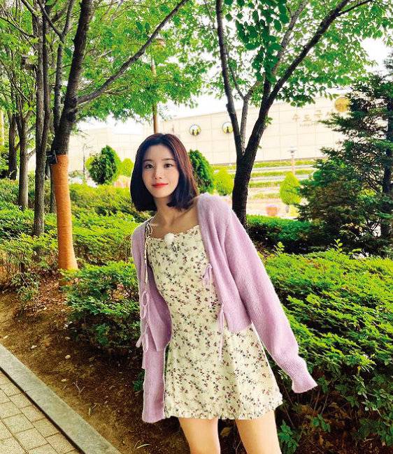 보라색 플로럴 패턴 미니원피스를 연보라색 카디건과 매치해 사랑스러운 컬러 플레이를 연출한 가수 권은비. 화사한 분위기 덕분에 가을 나들이 룩으로 활용해도 좋을 것 같다.