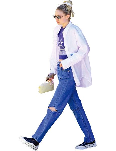 여유로운 실루엣의 화이트 셔츠는 활용도가 높아 간절기에 빠질 수 없는 아이템. 스트레이트 핏 데님에 베이비 티셔츠를 매치하고 스니커즈와 선글라스를 블랙 컬러로 맞춰 심플하면서도 시크한 분위기를 완성했다.