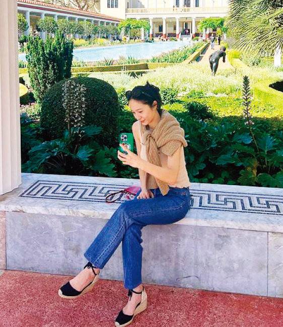오트밀 컬러 민소매 톱과 데님 팬츠, 그리고 어깨에 무심히 툭 걸친 브라운 컬러 카디건을 선택해 스타일리시한 리조트 룩을 연출했다.