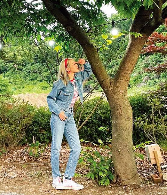 라이트 워싱 데님 재킷과 팬츠를 맞춰 입은 소녀시대 써니. 이너로 레드 스트라이프 톱을 매치하고 같은 컬러로 이어링과 헤어밴드까지 맞춰 1990년대 말 하이틴 스타일을 재현했다.