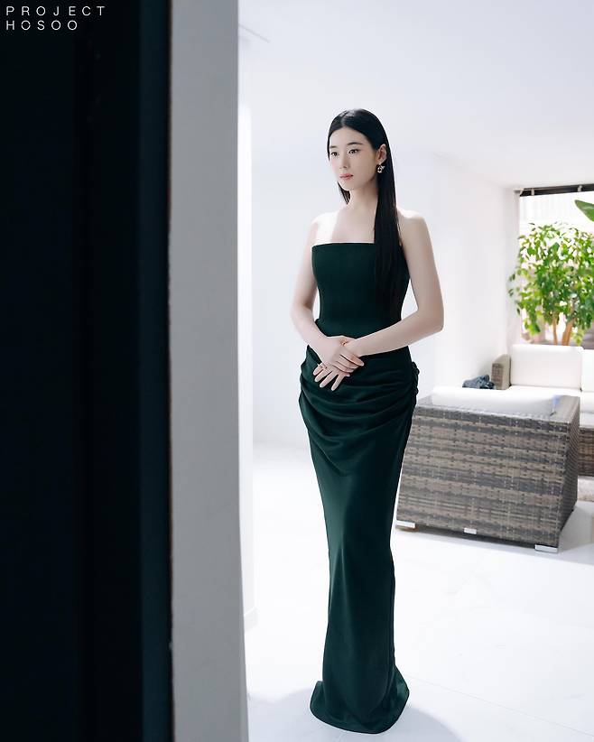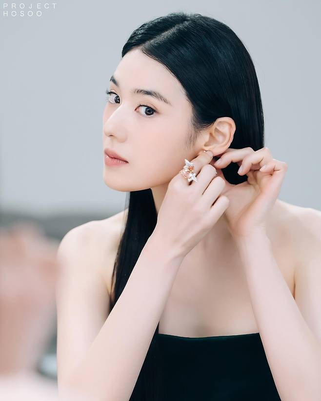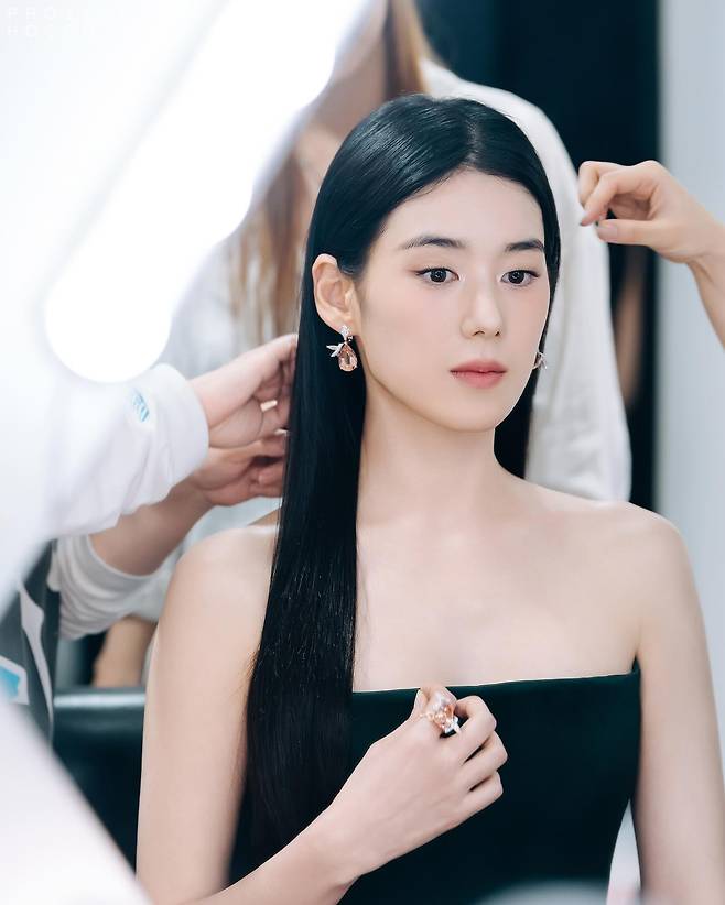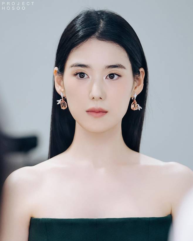 특히 드레스라인이 완벽하게 어깨를 드러내어 목선과 쇄골의 라인이 더 아름답게 강조되었고, 그 위에 놓인 핑크 골드 이어링이 얼굴의 윤곽을 더 부드럽게 만들었죠.