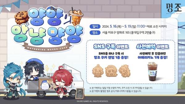 명조는 5월 16~19일 4일 동안 홍대입구역 2번 출구 앞에서 오프라인 특설 커피차 이벤트 '양양의 앙낭양양'을 진행한다. 현장에서 간단한 구독, 사전예약 이벤트에 참여하면 명조 캐릭터 쿠키와 아메리카노를 받을 수 있다.