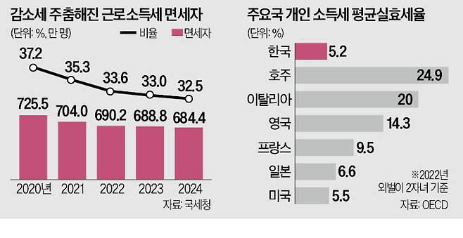 2021년 기준 미국(30.9%), 캐나다(13.6%), 호주(15.2%), 일본(14.5%) 등 주요국 근로소득세 면세자 비율은 한국을 밑돈다. 한국의 소득세 최고세율은 45%로 경제협력개발기구(OECD) 회원국 가운데 상위 6위다. 하지만 면세자 비율이 높은 탓에 소득세 평균실효세율(실제 소득 대비 세금 비율)은 2022년 기준 5.2%에 그쳤다. OECD 회원국 중 30위로 최하위권이다. 호주(24.9%), 이탈리아(20%), 영국(14.3%), 일본(6.6%) 등 주요국과도 격차가 컸다.