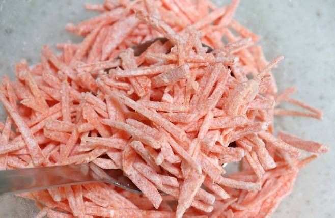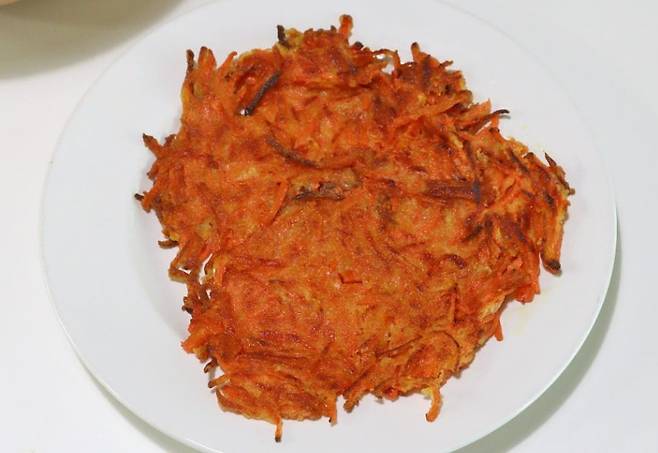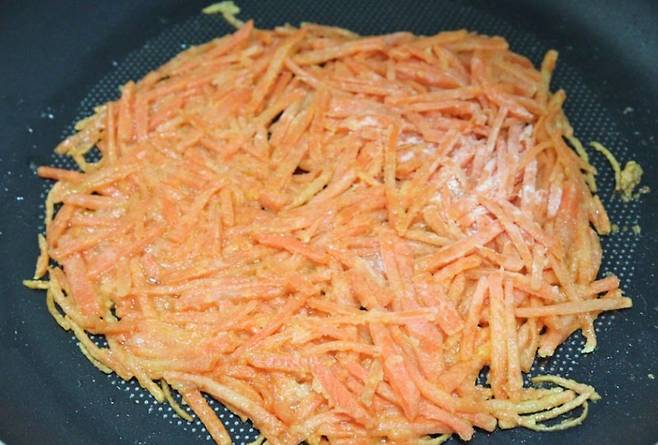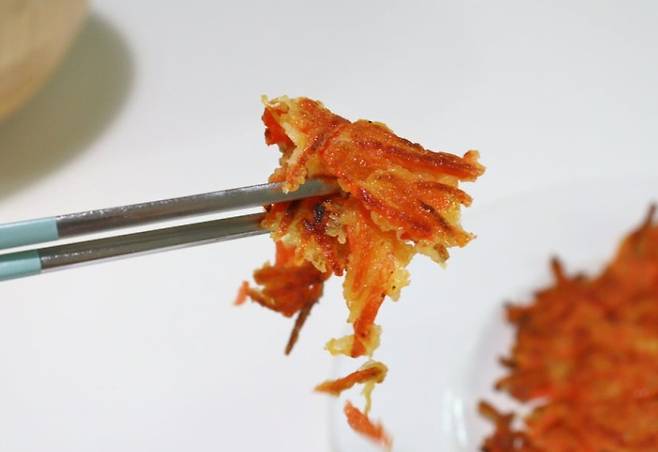 채 썬 당근에 소금 한 꼬집을 뿌려 2~3분간 절여두면 수분이 나오는데, 여기에 밀가루 대신 전분가루 2큰술을 넣고 가볍게 버무리면 영양 손실 없이 반죽을 완성할 수 있습니다.