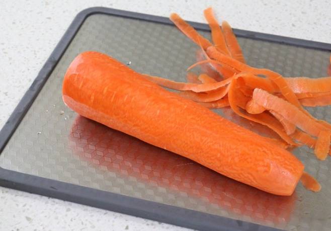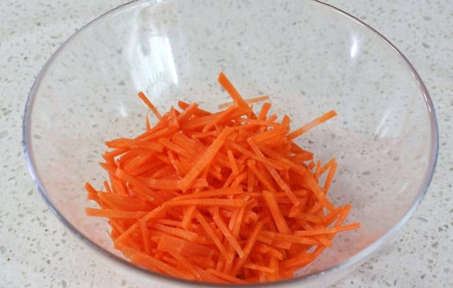 1. 당근을 깨끗이 씻어 껍질째 최대한 가늘게 채 썹니다. (항암 성분은 껍질 바로 밑에 가장 많습니다.)