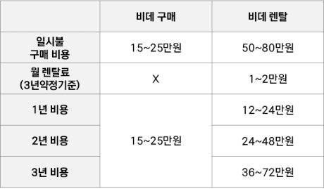 평균적인 비데 구매 가격과 렌탈 가격을 비교해보면, 2년만 사용해도 비데를 구매하는 것이 훨씬 더 저렴하다는 것을 알 수 있습니다. 그래서 극단적으로는 1년 렌탈 비용으로 새로운 비데를 매년 구매하는 것이 가성비로 더 낫기도 합니다.