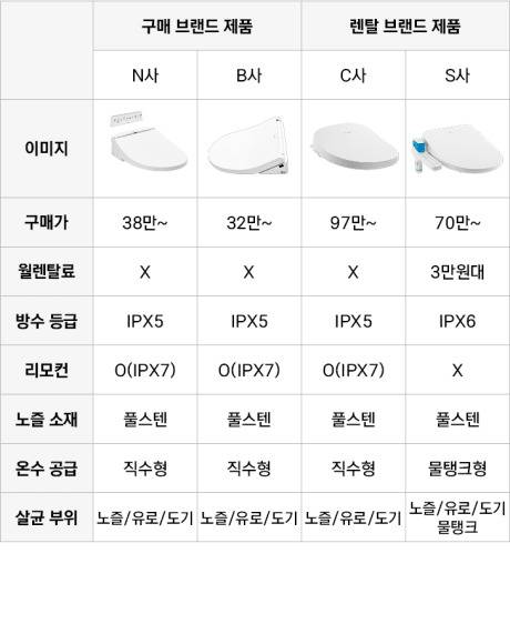 다만 주의해야 할 것은 비데를 구매할 때는 구매를 전문으로 하는 브랜드에서 선택해야 한다는 점입니다. 렌탈 브랜드 제품의 일시불 구매가는 50~80만원 정도로 매우 비싸기 때문입니다. (단, 렌탈 브랜드 내에서도 구매 전용 모델이 일부 존재합니다.)